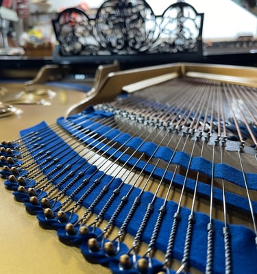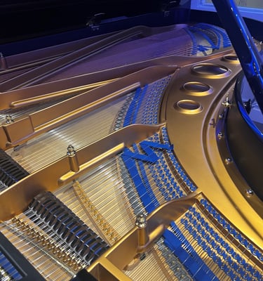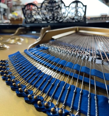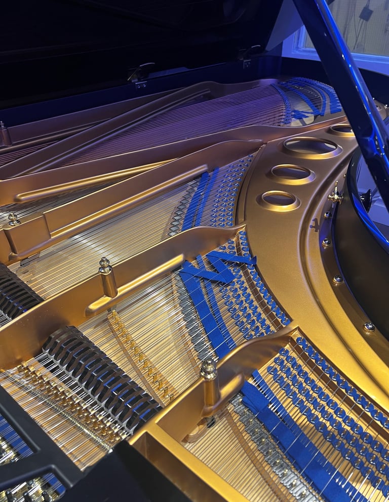 From note 47 upwards, an additional fourth string sits above the struck strings and vibrates sympathetically. This creates a shimmering halo of resonance that lifts the treble register and gives the instrument its famous golden singing tone.